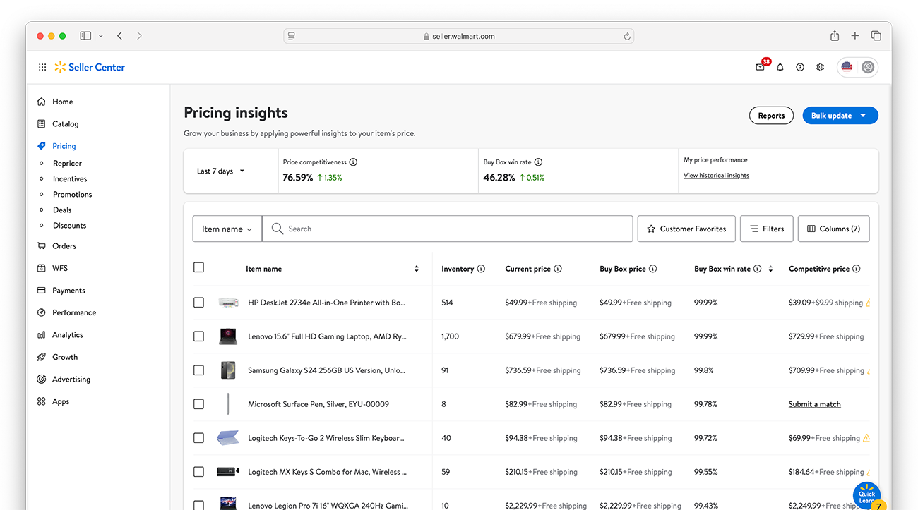 How it works: After you set pricing rules for your SKUs, your item prices are automatically adjusted based on winning Walmart Buy Box offers or prices for similar items found on external sites. This program automatically updates prices for items you enroll based on market conditions, so you don’t have to update your prices manually.